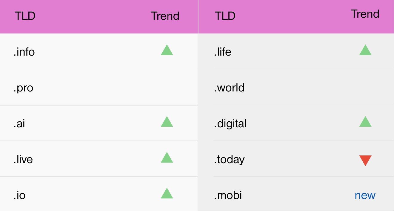 在頂級域名的競爭格局中,.info和.pro 依然占據(jù)著領(lǐng)先地位。.info 持續(xù)作為內(nèi)容豐富型信息網(wǎng)站的首選,而.pro則牢牢鞏固了其在專業(yè)服務(wù)領(lǐng)域的權(quán)威形象。這兩大傳統(tǒng)頂級域名的穩(wěn)定表現(xiàn),證明了市場對其清晰定位的高度認(rèn)可。