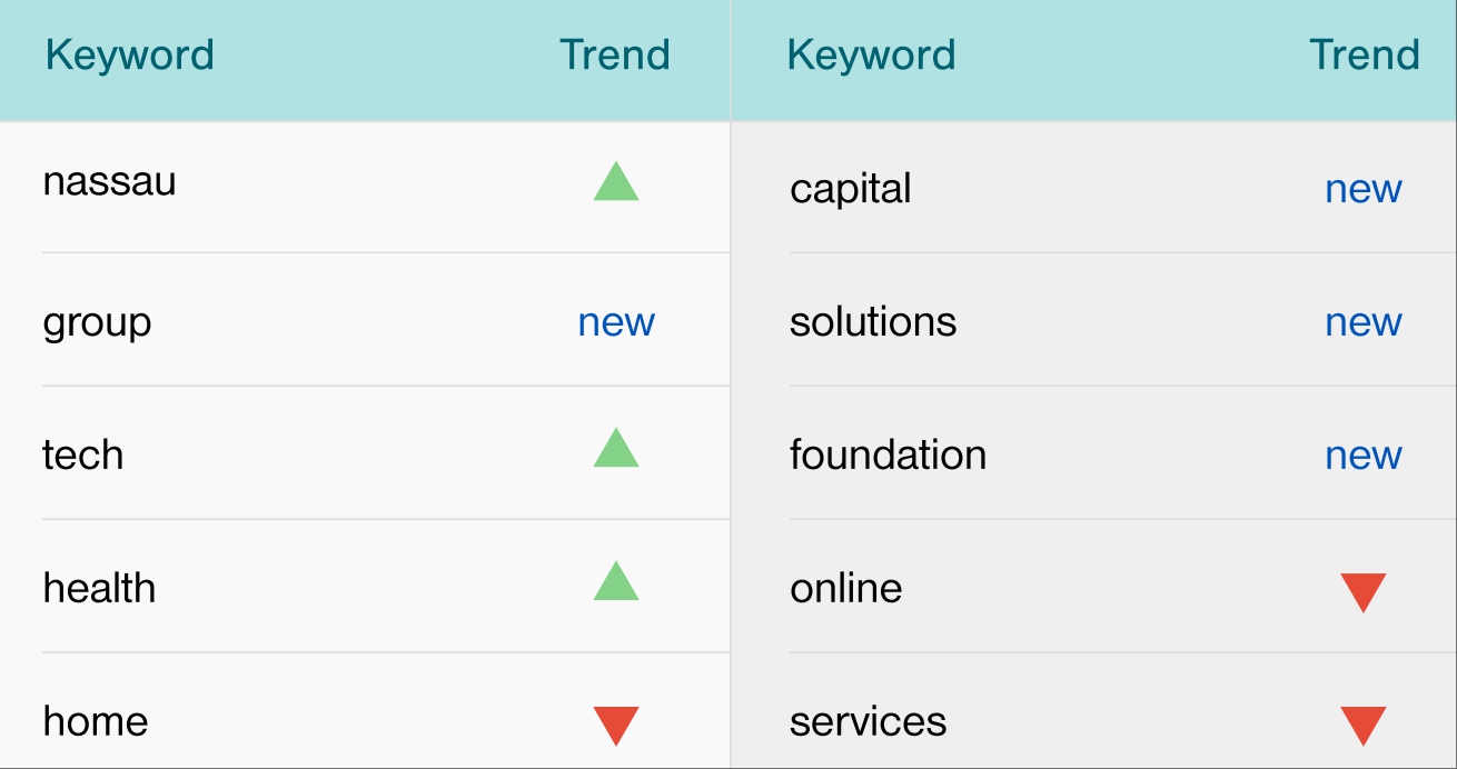 本季度的關(guān)鍵詞排行榜也出現(xiàn)了有趣的變化。在最受歡迎的10個二級域名關(guān)鍵詞中,金融相關(guān)術(shù)語“capital”(資本)、“group”(集團(tuán))、“solutions”(解決方案)和“foundation”(基金會)進(jìn)入前十。這一變化暗示了來自金融科技和非營利組織的域名注冊需求正在升溫。此外,地理位置關(guān)鍵詞的排名也有所上升,特別是與“nassau”相關(guān)的 .info 域名注冊量激增,使其一舉沖上榜首。這再次證明了具有明確地理標(biāo)識或行業(yè)屬性的域名在構(gòu)建專業(yè)和可信賴的在線形象方面具有不可替代的價值。